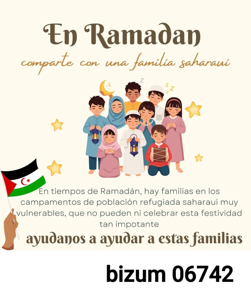 Semana 17 al 22 febrero.- En los primeros días de Ramadán hemos sostenido a 60 familias Saharauis de todas las wilayas: Auserd 10, Smara 10, Bojador 10, Aaiun 10 y Dajla 20. El coste de este primer envío ha sido de 2771 €. Las cestas contenían productos muy útiles en éste mes sagrado. La recaudación de esta primera semana ha sido de 100e. La colaboración puede hacerse hasta el 15 de marzo. Seguiremos informando. Código bizum 06742