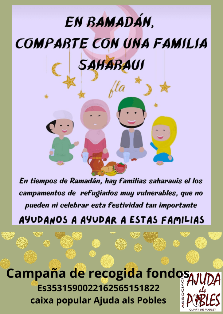 Nuestra campaña de «colabora con una familia saharaui» se ha vuelto a lanzar para poder contribuir con familias vulnerables de los campamentos. Ya hemos empezado con compras en Dajla, Aaiun y Smara. Continuaremos con todas las wilayas. Tu puedes aportar a esta recolecta, a través dela cuenta del cartel o mediante bizum al código 06742. Gracias 🙏
